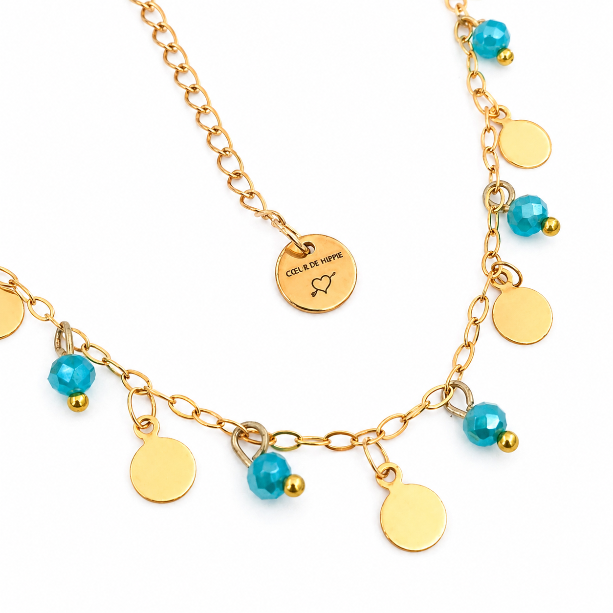Collier composé d'une chaîne à petits maillons et médaillons dorés en acier inoxydable, orné de perles de verre turquoise facettées. Ajustable avec chaîne d'extension. Création unique Coeur de Hippie.