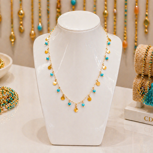 Illuminez vos tenues avec ce collier turquoise et doré au charme bohème !