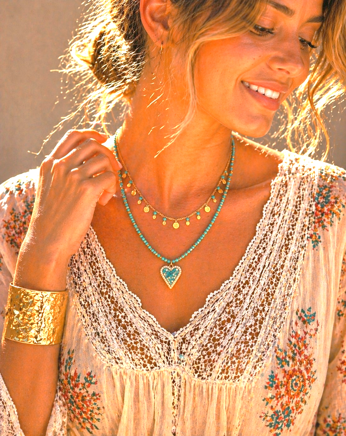Parfait avec le Collier pierres naturelles pendentif cœur émail et strass turquoise pour une composition bohème chic lumineuse.
