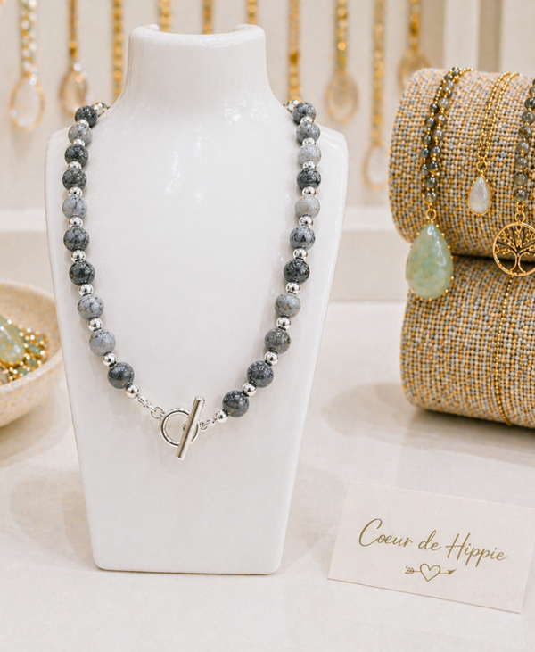 Collier en pierres naturelles de jaspe gris (8 mm), perles d'hématite argentées et fermoir T en acier inoxydable. Longueur courte (47 cm), non ajustable. Création unique Coeur de Hippie.