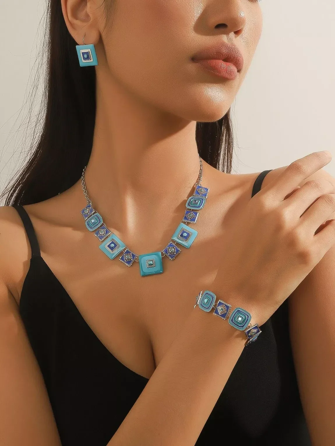 Ce collier se distingue par ses médaillons de forme carrée en véritable émail bleu, finement travaillés et ornés de strass.