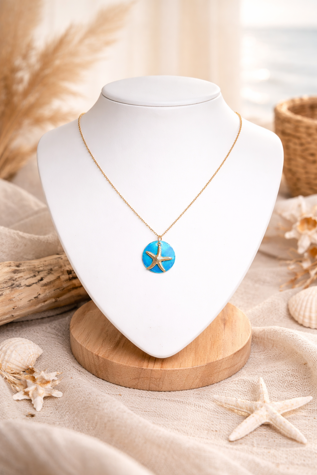 Collier pendentif en Nacre bleu lagon et étoile de mer dorée - acier inoxydable