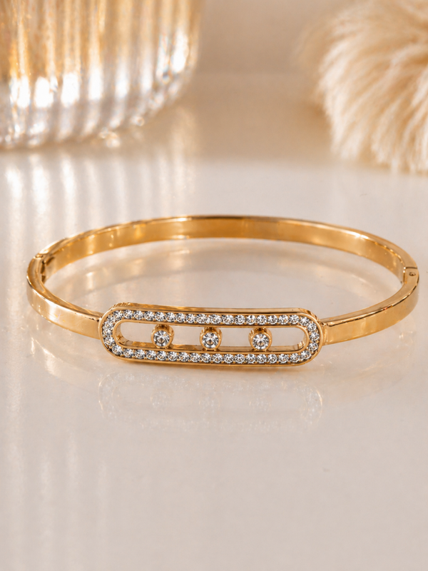 Bracelet jonc en acier inoxydable doré, disponible aussi en argent, design ovale cerclé de strass scintillants, accompagné de trois billes mobiles qui roulent selon les mouvements. Fermeture et ouverture par clip.