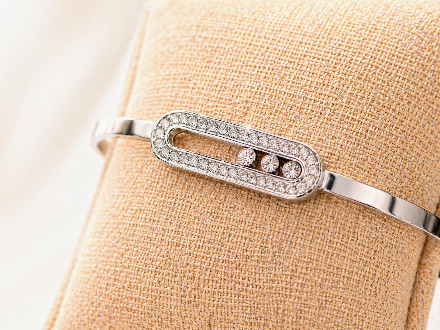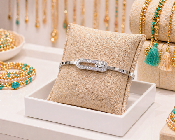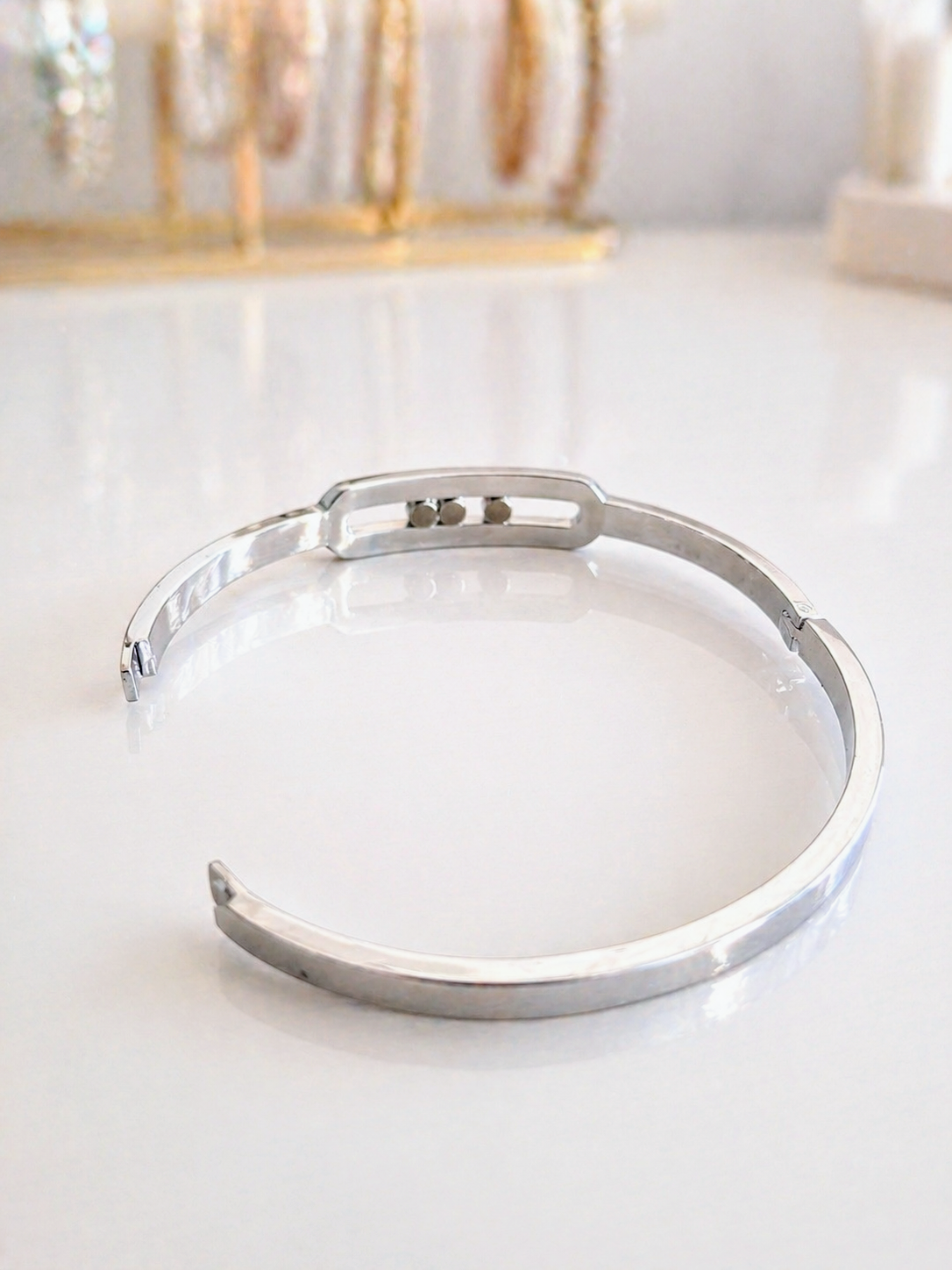 On aime : son design chic et intemporel, ses billes de strass qui se déplacent à chaque mouvement, son ouverture et fermeture par clip qui s'adapte facilement aux poignets et son acier inoxydable doré résistant dans le temps.