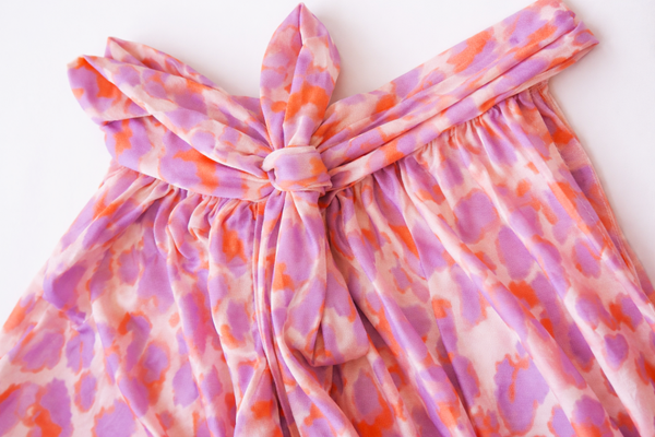 Top fluide à imprimé léorpard parme, en matière douce et fluide, avec encolure américaine à nouer au dos pour un ajustement parfait et base élastiquée.