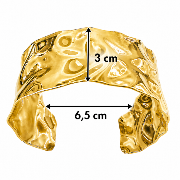 Bracelet manchette large en acier inoxydable disponible en modèle doré ou argenté, design bosselé. Largeur 3 cm, diamètre intérieur 6,5 cm. Ouverture permettant un ajustement facile au poignet.
